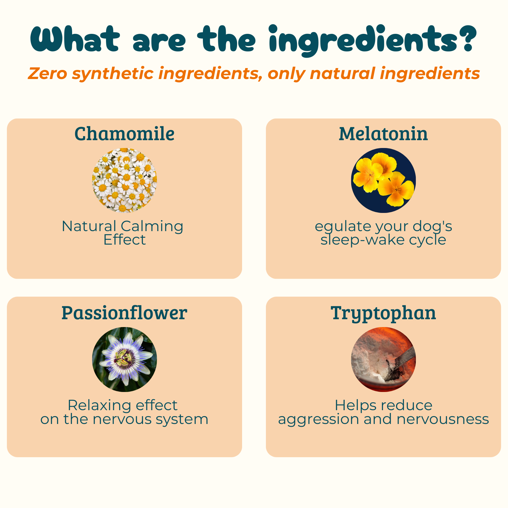 It promotes the production of serotonin, the hormone that regulates mood and calmness. It helps reduce irritability, nervousness, and anxiety, improving the dog's overall serenity.
