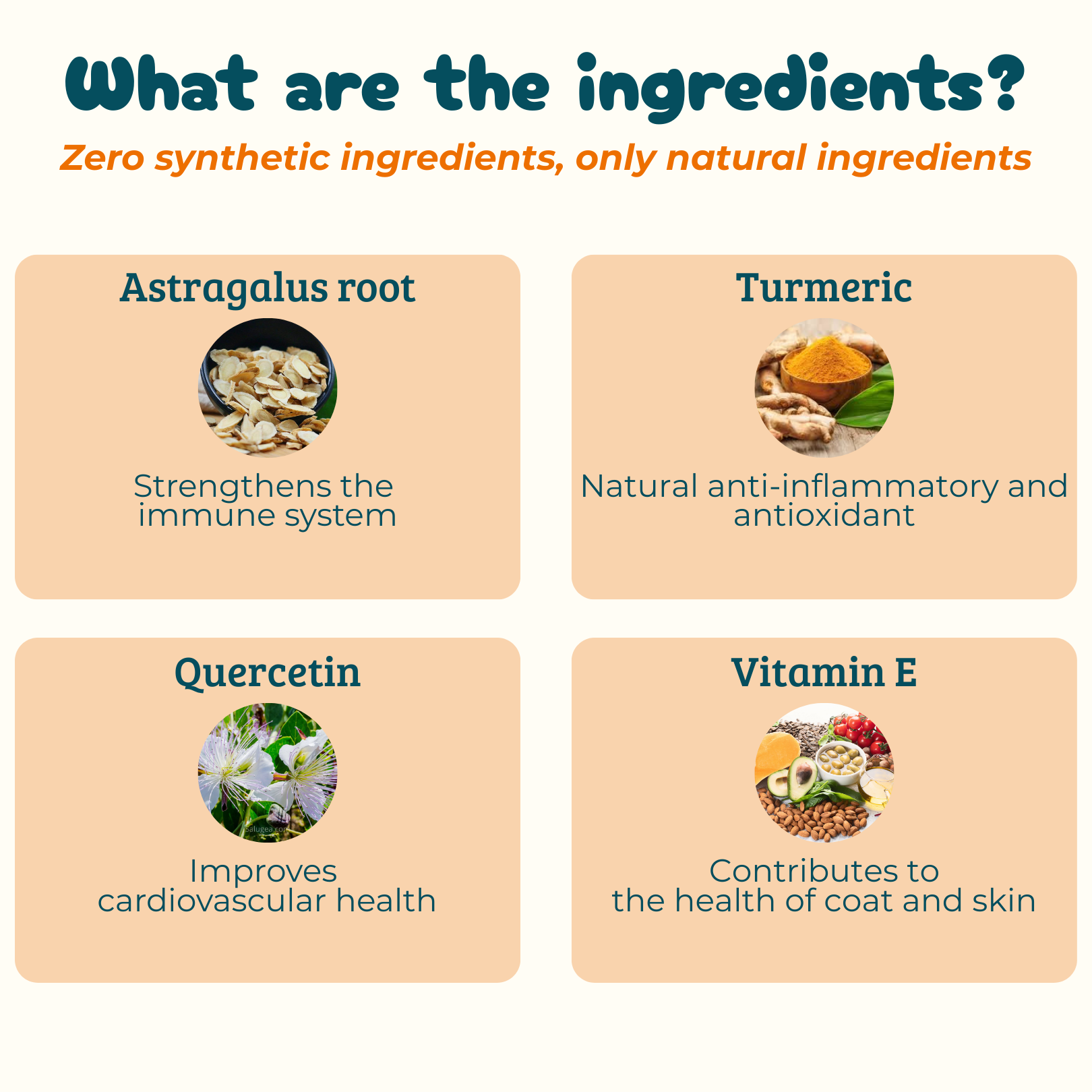 Vitamins (B2, B6, B12) strengthen the dog's natural defenses, helping it to react better against allergies and irritants.
