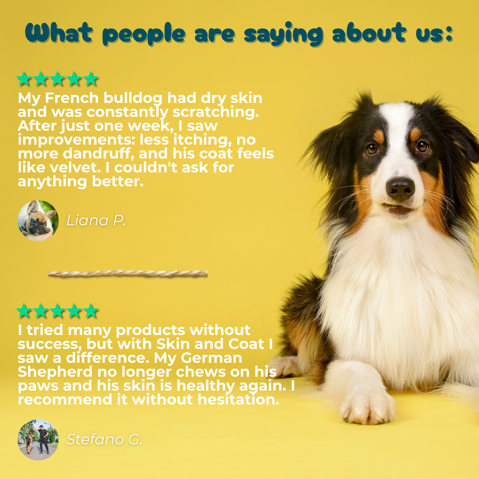 "My dog was constantly scratching himself and had red skin. With BauVet Itch Solution , the situation improved in just a few weeks: less itching, healthier skin, and a shiny coat again. 👍 "